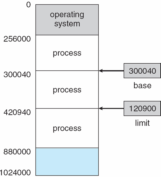 - Ex: If the base register holds 300040 and the limit register is 120900, then the program can legally access all addresses from 300040 through 420939 (inclusive).