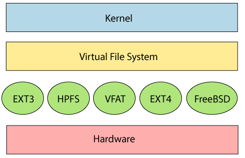 The first two parts of the given file system together called a Linux virtual file system. It provides a single set of commands for the kernel and developers to access the file system. This virtual file system requires the specific system driver to give an interface to the file system.