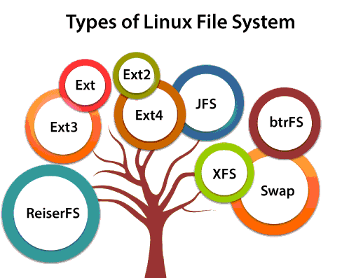 When we install the Linux operating system, Linux offers many file systems such as Ext, Ext2, Ext3, Ext4, JFS, ReiserFS, XFS, btrfs, and swap.